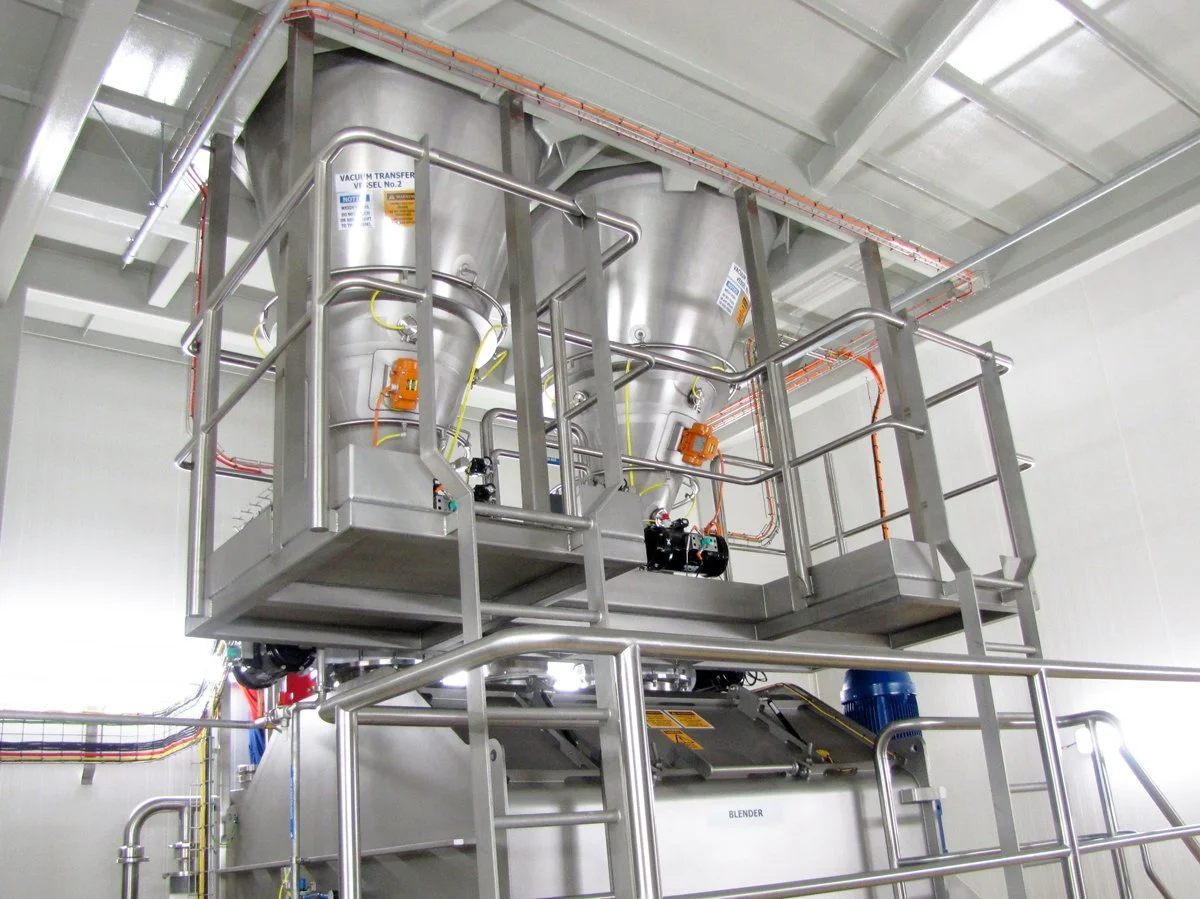 Typically the process relies on 25kg bags of powder being tipped and then conveyed by vacuum to batch weigh vessels mounted above a Forberg style Twin paddle mixer.